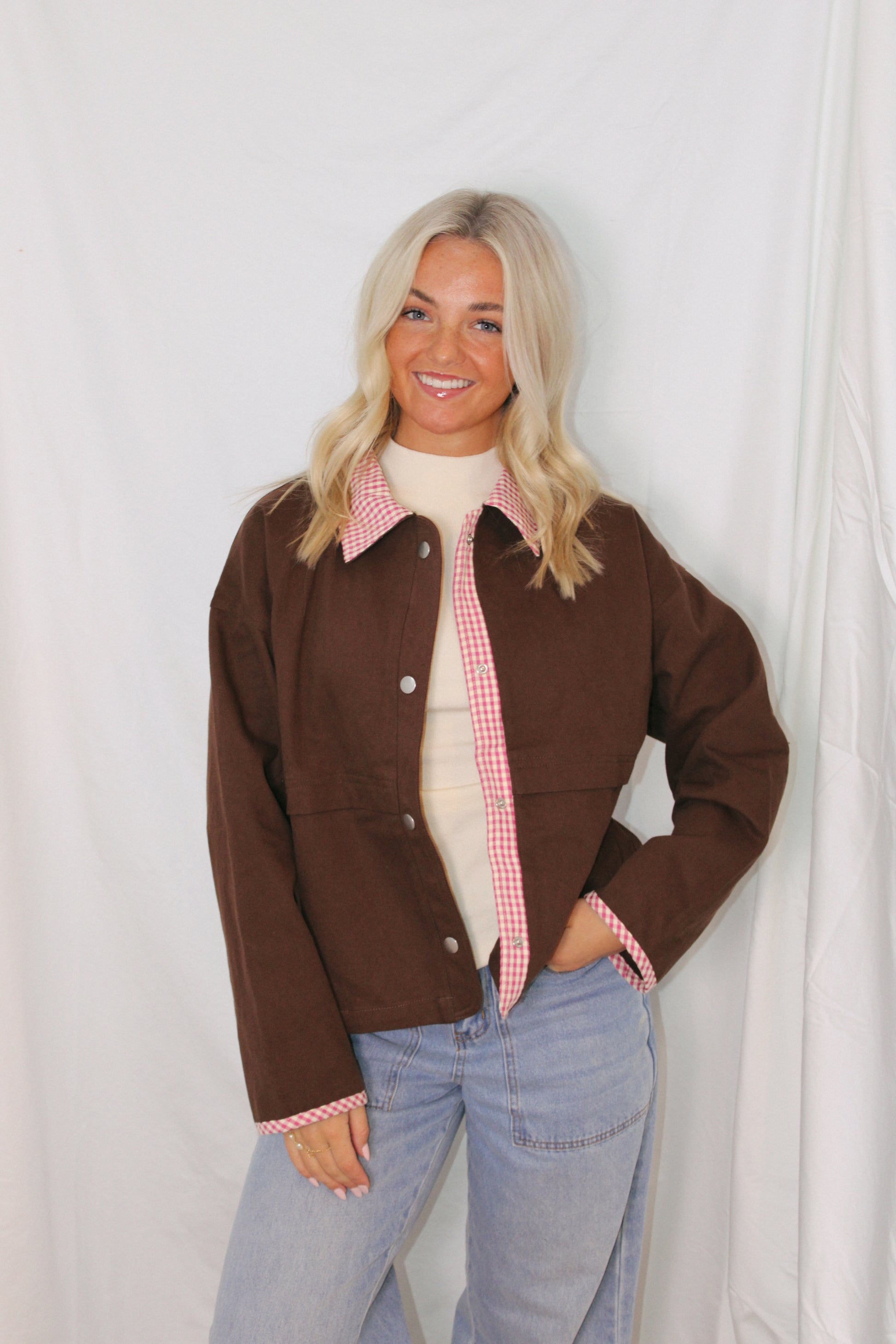 The prettiest jacket you’ll ever own. This Alpine Gingham Jacket features the sweetest gingham contrast detailing with a structured yet comfortable fit that’s so flattering on. The perfect layering piece to elevate any everyday look while still feeling effortless and cozy.